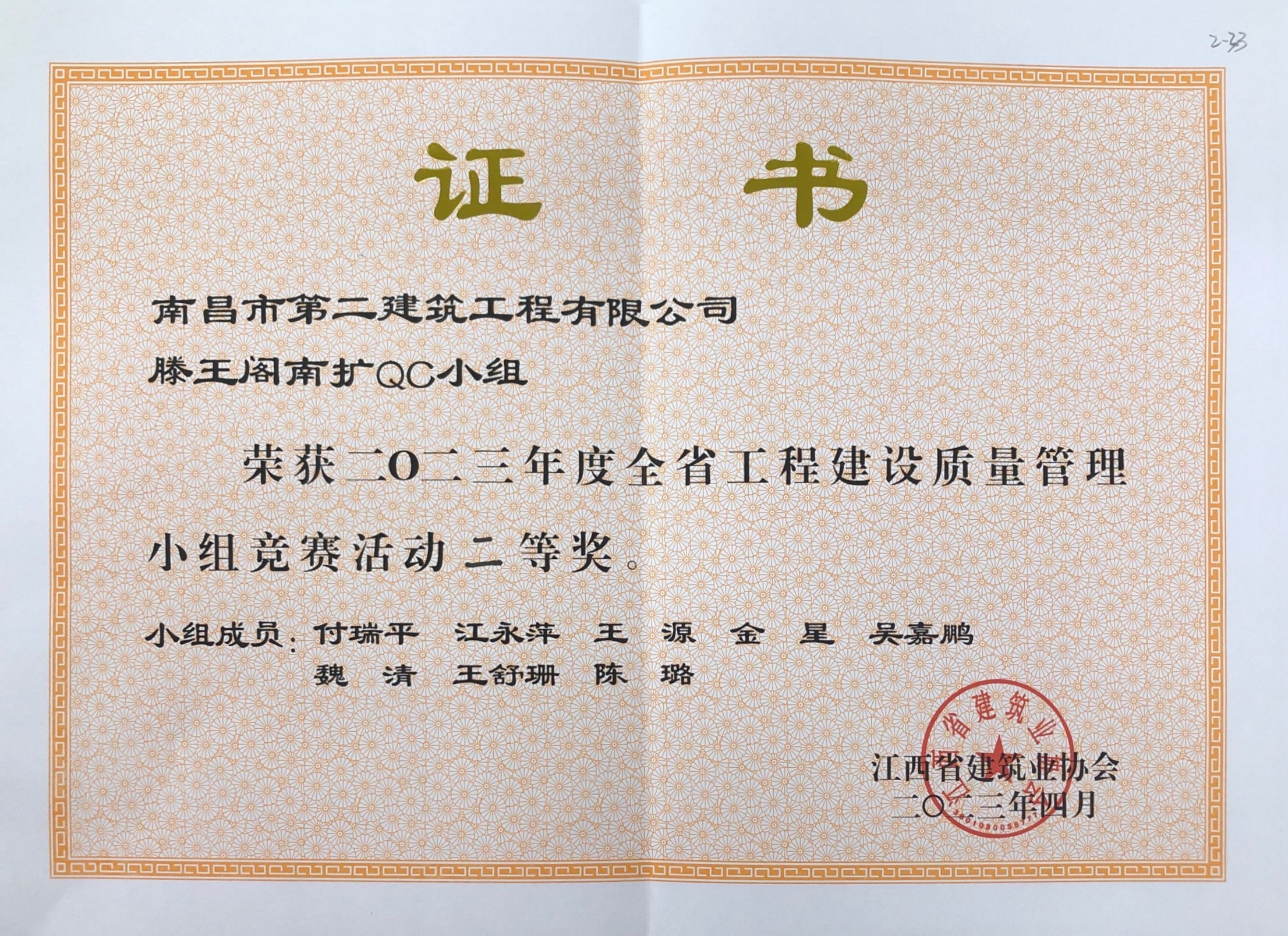 公司QC活动成果荣获2023年江西省工程建设质量管理小组竞赛活动二等奖