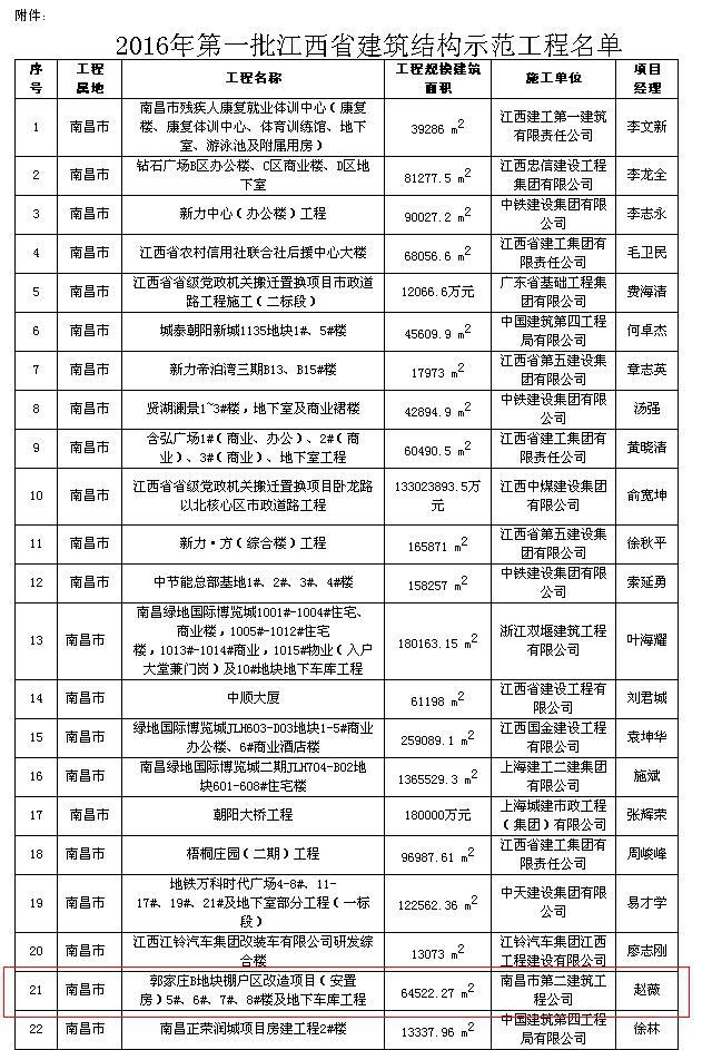 由南昌市第二建筑工程公司承建的郭家庄B地块棚户区改造项目(安置房)5#、6#、7#、8#楼及地下车库工程获“2016年第一批江西省建筑结构示范工程” [摘自赣建质监字[2016]1号]。