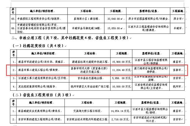 【概要描述】 由南昌市第二建筑工程公司承建的江西旺旺新建厂房1#车间工程获“2015年度江西省优良工程奖”,宜春市明月大桥(原宜春大桥)改建及引道工程...