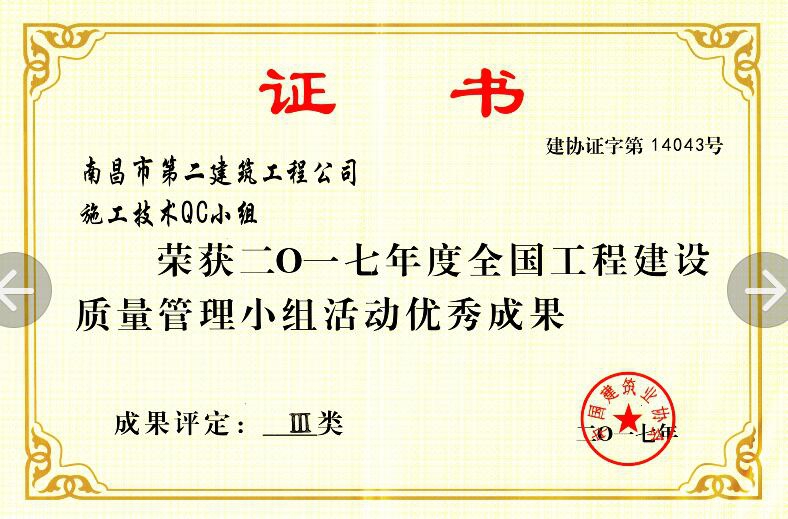 在中国建筑业协会组织的2017年度QC成果发布会上,公司QC小组的《提高GC发泡水泥保温板外墙外保温施工质量》成果荣获2017年度全国工程建设质量管理小组活动优秀成果奖;付瑞平同志荣获2017年度全国工程建设QC小组活动优秀推进者称号。